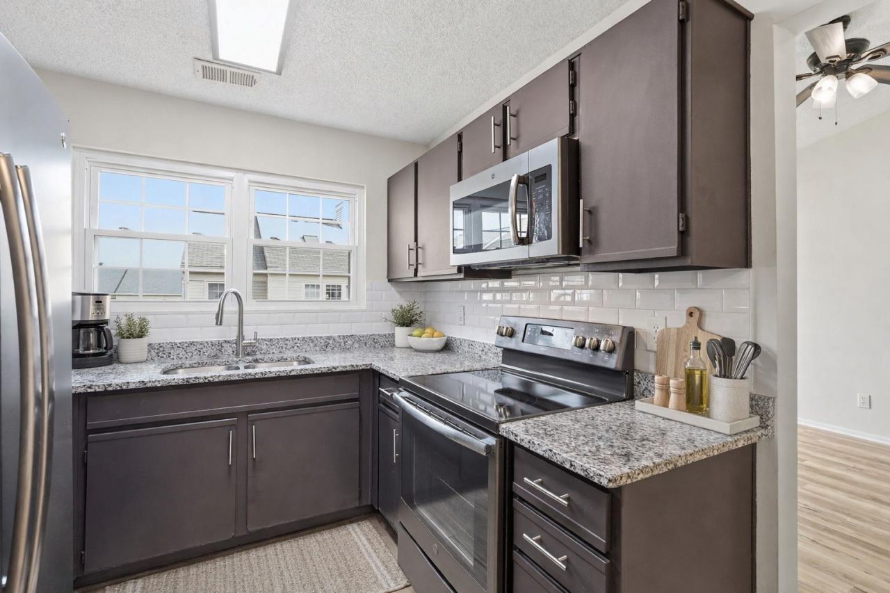 This top-level, beautifully updated 2-bedroom, 1-bath residence offers an effortless blend of comfort and style, with light-filled living spaces that feel both open and inviting. New flooring extends throughout, complemented by fresh, professional paint and a thoughtfully refreshed bath featuring a new vanity, lighting, and fixtures. The kitchen is both functional and polished, complete with granite countertops, stainless steel appliances, a pantry, and a charming breakfast nook that invites slow mornings or casual evenings at home. The main living area unfolds with cathedral ceilings, a skylight that draws in natural light throughout the day, and a wood-burning fireplace that adds warmth and character. The primary bedroom provides a quiet retreat with a walk-in closet and direct access to the full bath, while the second bedroom offers versatility with built-in shelving and comfortable proportions. A brand new washer and dryer add a layer of everyday convenience. Ideally positioned in the heart of Leesburg, this home places you just moments from premier shopping, including the Leesburg Outlets, and within easy reach of the timeless charm of historic downtown.